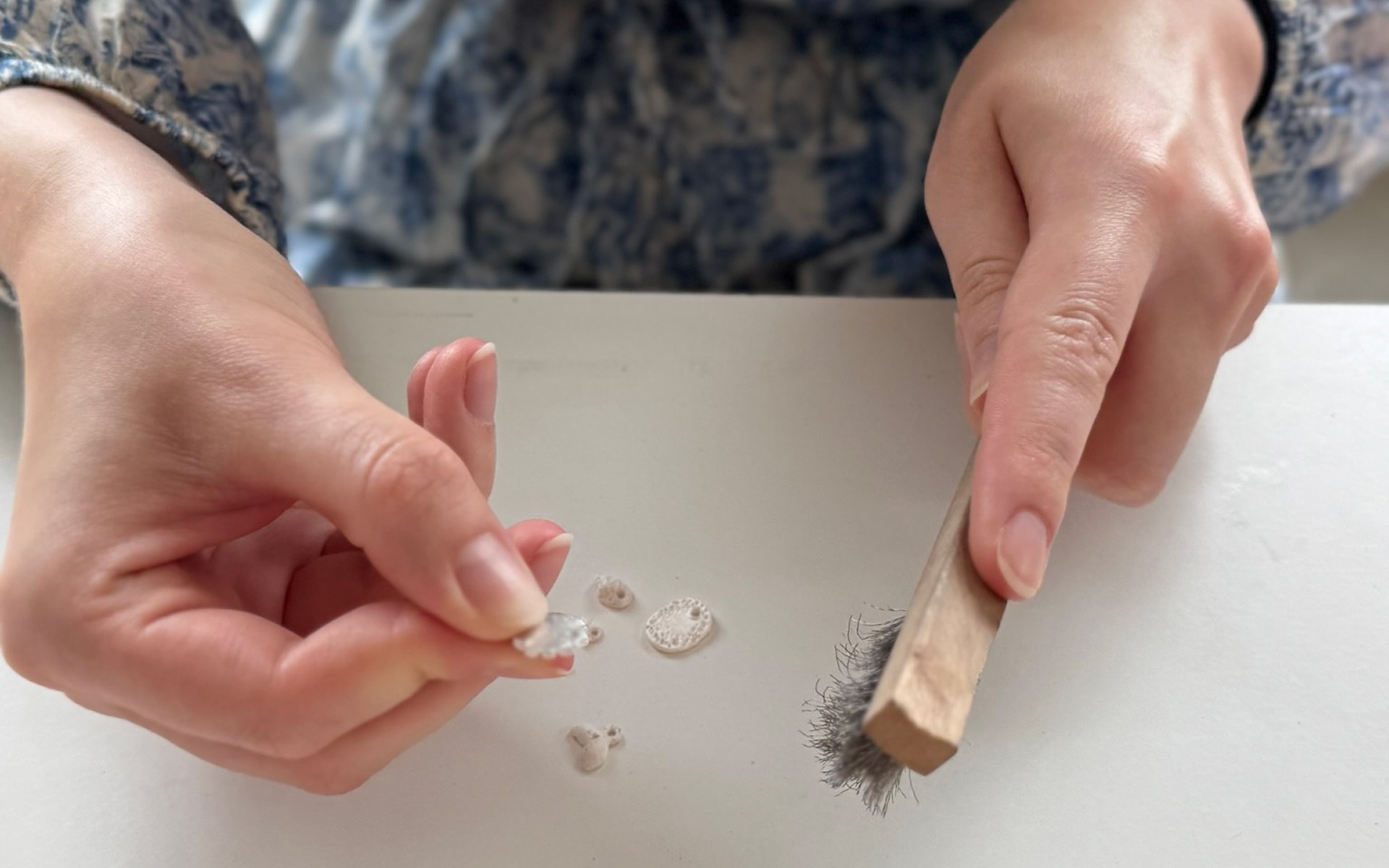 We werken met zilverklei, een bijzonder en gerecyled materiaal uit Japan, we branden de klei weg waardoor 999 puur zilver overblijft. Onder begeleiding van een gecertificeerd zilverklei-instructeur leer je hoe je dit materiaal omtovert tot een blijvend sieraad. Je bepaalt zelf je ontwerp: strak en modern, speels en organisch, met een stempel, reliëf of tekst. Alles mag, er is veel mogelijk en je wordt geholpen om jouw idee om te zetten in een blijvende herinnering.