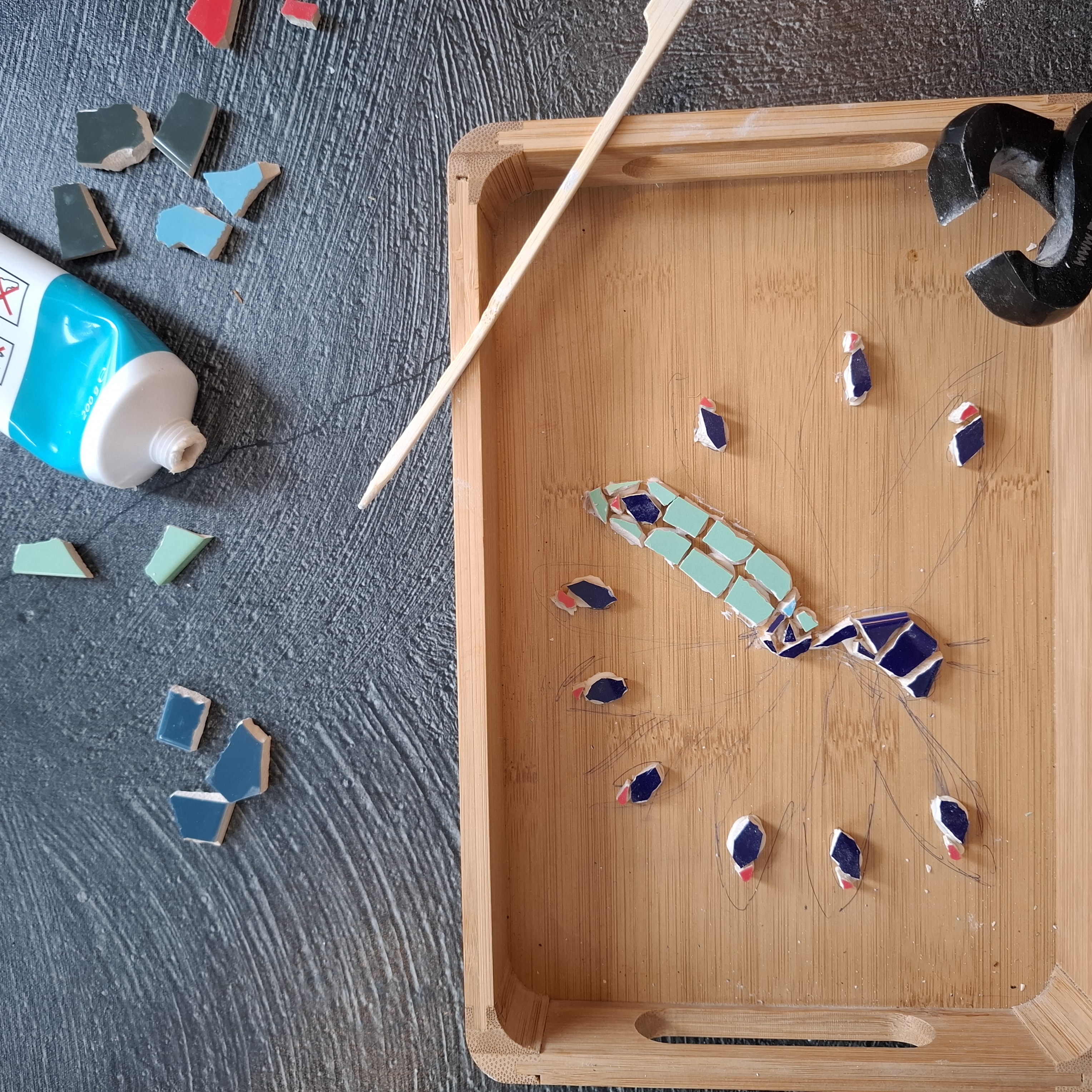 Je kunstwerk kan vanuit een eigen tekening ontstaan of door de tegeldelen willekeurig te plakken. Ik leer je hoe je dat doet.