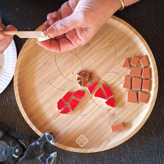 Je kunstwerk kan vanuit een eigen tekening ontstaan of door de tegeldelen willekeurig te plakken. Ik leer je hoe je dat doet.