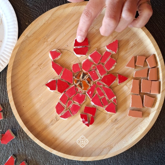 LET OP: Het voegen van het mozaïek doen we niet tijdens de workshop zelf. Het is belangrijk dat je werkstuk eerst 24 uur droogt om de stevigheid te waarborgen. Maar geen zorgen! Je krijgt een zakje voegmiddel, sponsje en een duidelijke voeginstructie mee, zodat je het thuis eenvoudig kunt afmaken.