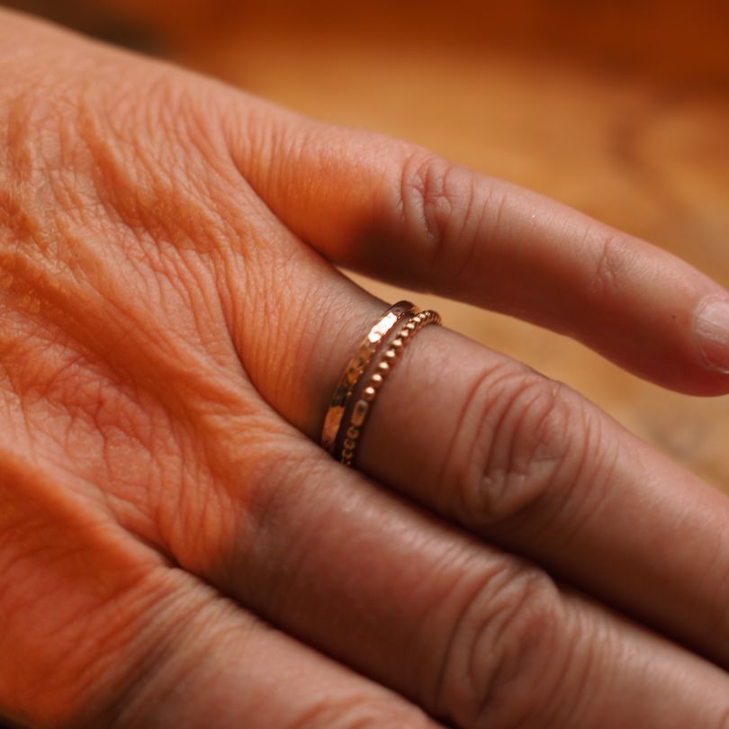 Voor de ringen kun je kiezen uit verschillende soorten ringen. Zo kun je gaan voor een ring van bolletjes draad, rond draad of eierdraad. Ook heb je keuze uit de afwerking van de ringen door ze bijvoorbeeld te hameren. Laat je inspireren door de mogelijkheden van zilveren sieraden smeden.