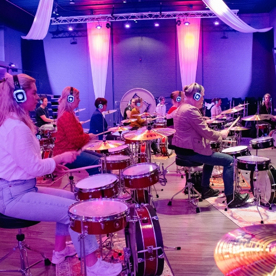 Er zijn 25 complete drumstellen beschikbaar, en dankzij een slimme opzet kunnen er tot wel 50 personen tegelijkertijd meedoen. De workshop duurt gemiddeld tussen de 1,5 en 2 uur, maar is flexibel in te passen in jouw programma. Meerdere sessies achter elkaar? Geen probleem!
