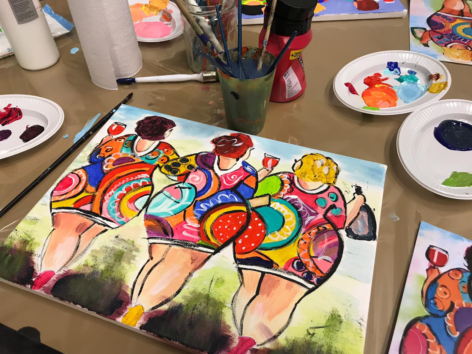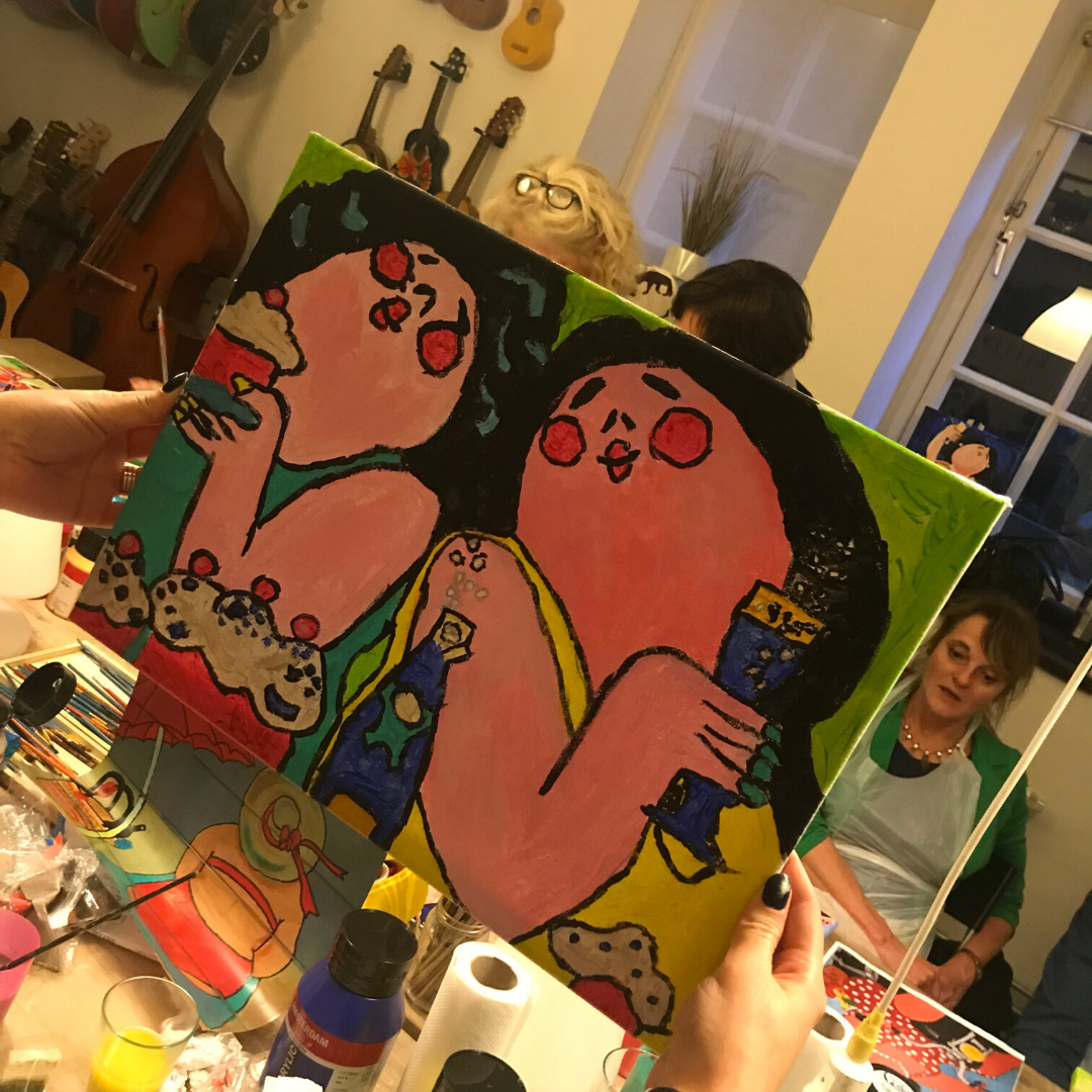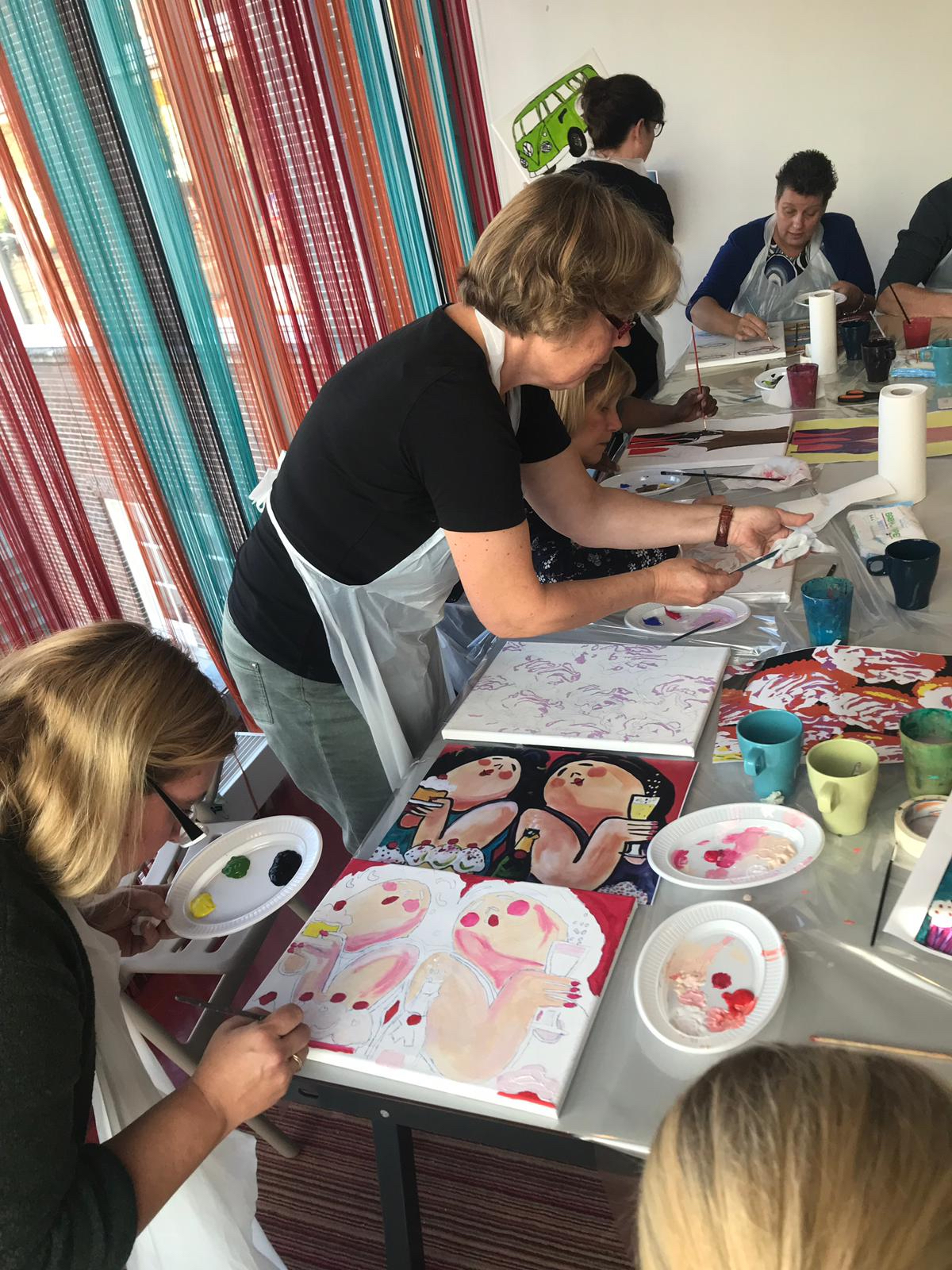 De workshop Dikke Dames schilderen is razend populair. Heel begrijpelijk, want Dikke Dames stralen één en al gezelligheid uit. Schilder bijvoorbeeld een Dikke Dame met een glas wijn of een heerlijk gebakje! Of een verliefde dikke dame, want deze dames houden van gezelligheid en iets lekkers.