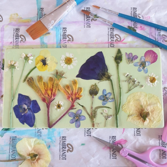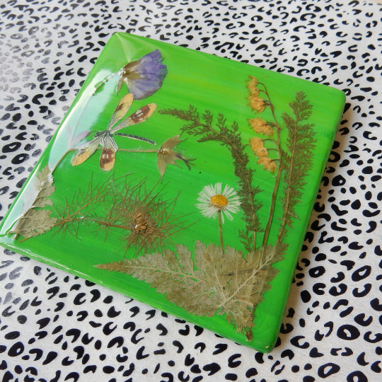 Een creatief ontspanningsmoment. Een gezellig middagje of avondje weg Complete workshop met ruime keuze aan materialen zoals: Gedroogde bloemen, bladeren, papier, verf, prints, sjablonen de mogelijkheid om je eigen bloemen te drogen! Mooie terracotta tegel. luxe epoxy giethars laag ophanghaakje, zodat je jouw kunstwerk op kan hangen De mogelijkheid persoonlijke meegebrachte items toe te voegen aan het werk.
