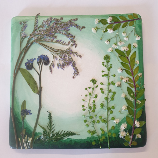 Een creatief ontspanningsmoment. Een gezellig middagje of avondje weg Complete workshop met ruime keuze aan materialen zoals: Gedroogde bloemen, bladeren, papier, verf, prints, sjablonen de mogelijkheid om je eigen bloemen te drogen! Mooie terracotta tegel. luxe epoxy giethars laag ophanghaakje, zodat je jouw kunstwerk op kan hangen De mogelijkheid persoonlijke meegebrachte items toe te voegen aan het werk.