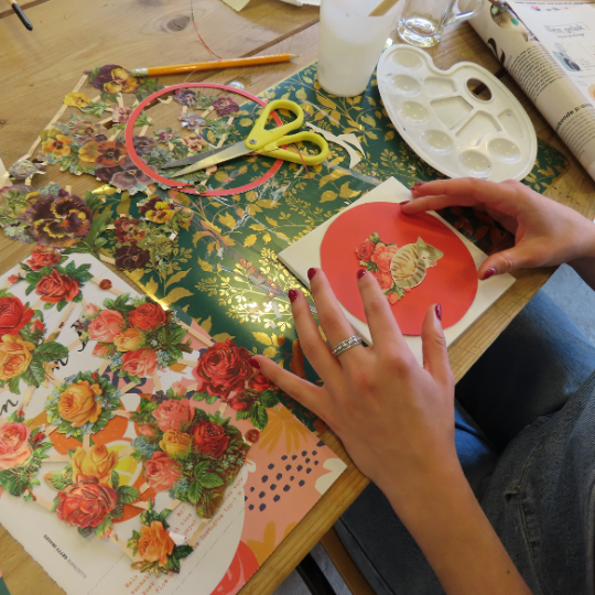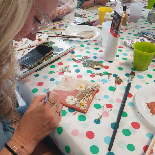 Een creatief ontspanningsmoment. Een gezellig middagje of avondje weg Complete workshop met ruime keuze aan materialen zoals: Gedroogde bloemen, bladeren, papier, verf, prints, sjablonen de mogelijkheid om je eigen bloemen te drogen! Mooie terracotta tegel. luxe epoxy giethars laag ophanghaakje, zodat je jouw kunstwerk op kan hangen De mogelijkheid persoonlijke meegebrachte items toe te voegen aan het werk.