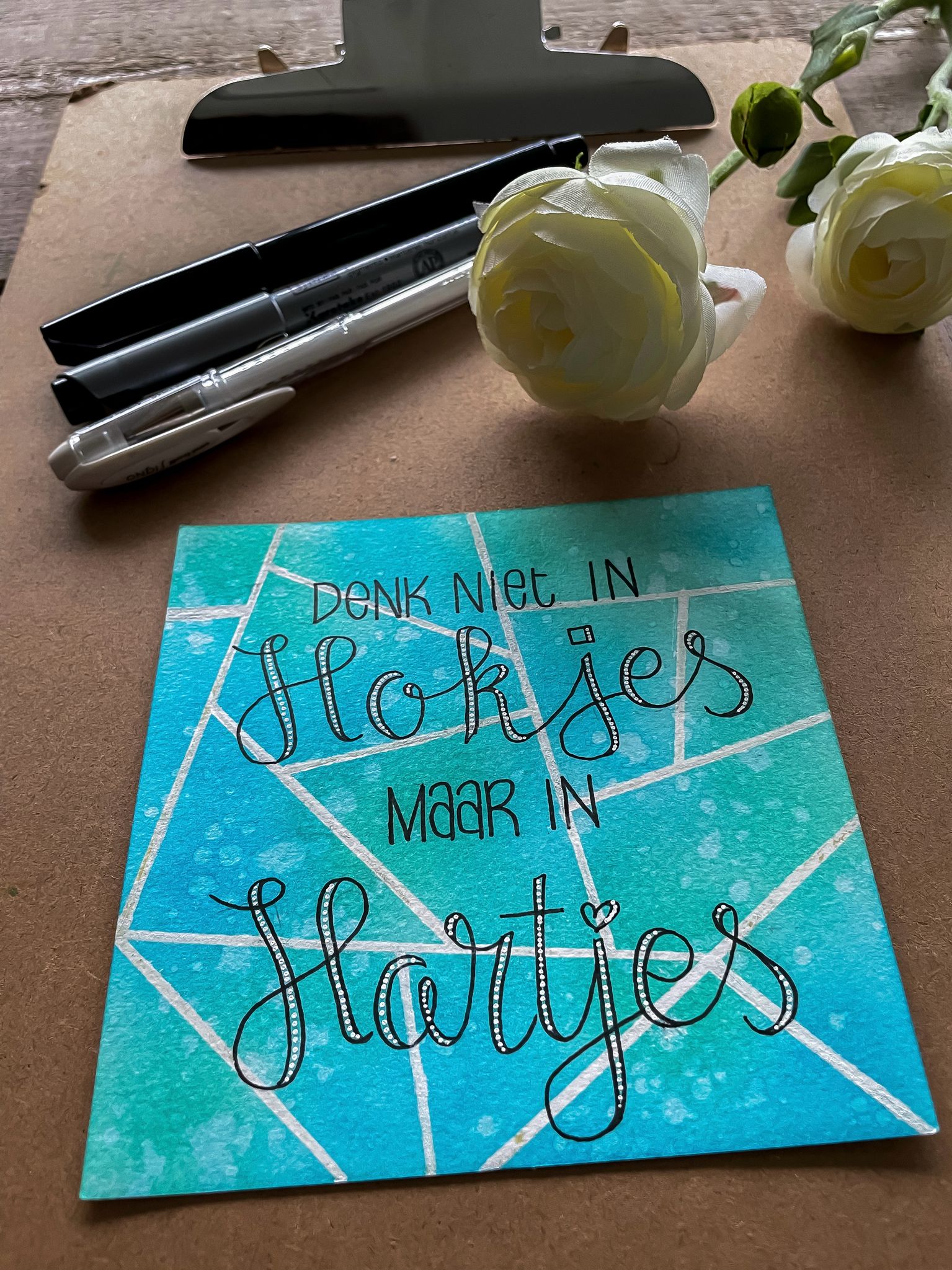 We beginnen met het oefenen van verschillende lettertypes, lijnen en versieringen. Daarna leer je hoe je een mooie compositie maakt met een quote of naam. Je maakt een persoonlijke handlettering op een kaart of poster ander werkstuk. Perfect om cadeau te geven of in te lijsten!