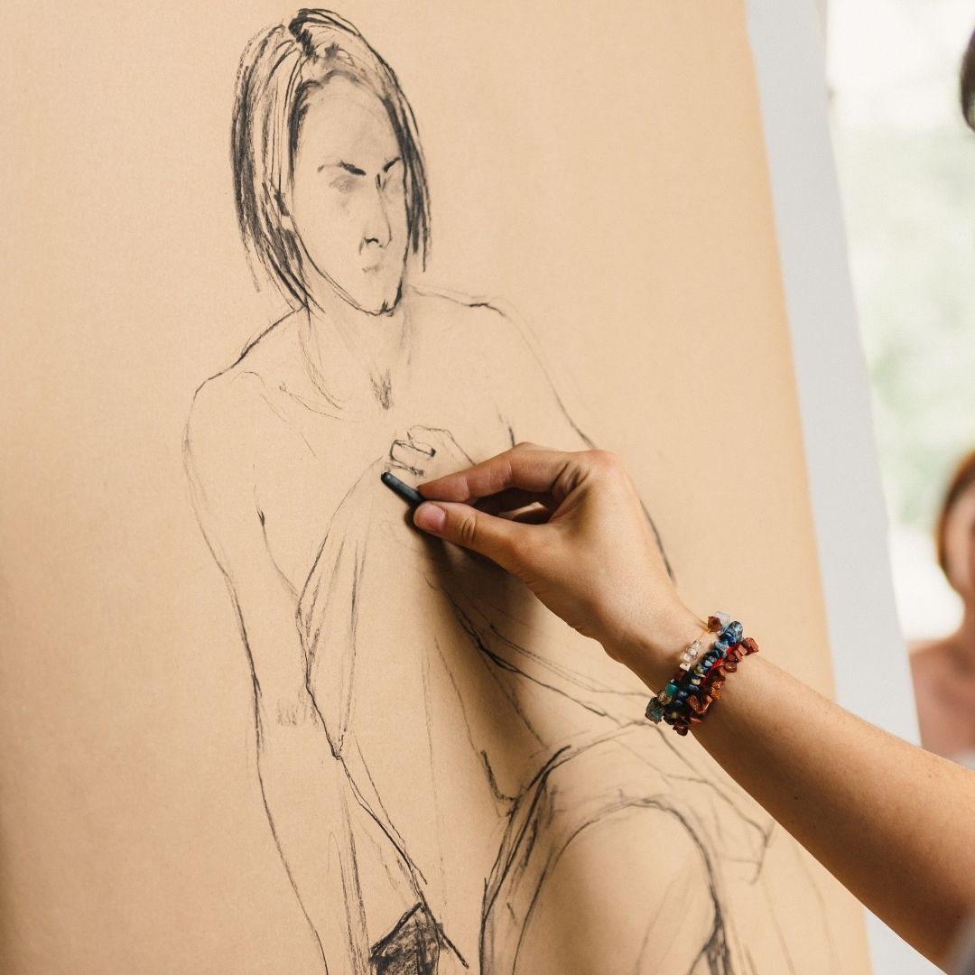 Maar deze workshop draait niet alleen om de lol, jullie gaan ook echt aan de slag met kunst. Onder begeleiding van een ervaren docent oefenen jullie eerst de basis van modeltekenen met houtskool op schetspapier. Verschillende poses en technieken komen voorbij, waardoor jullie spelenderwijs leren kijken en tekenen. Daarna zetten jullie de ultieme pose van het naaktmodel, om in een blijvend kunstwerk: een schilderij op canvas (30 x 40 cm) dat mee naar huis gaat als uniek aandenken.